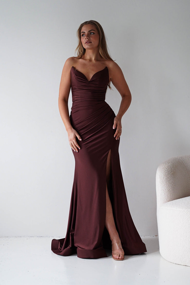 Visenta Ruched Bodice Strapless Gown | Espresso