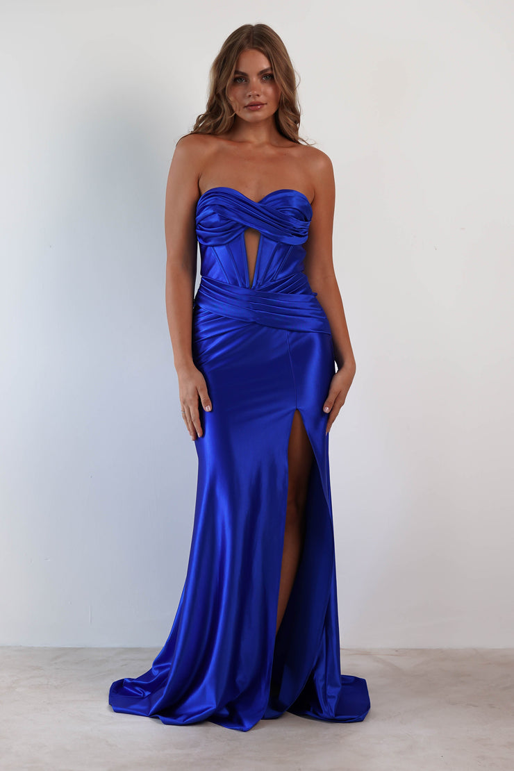 Command attention with this sleek and sophisticated black-tie strapless gown, the perfect choice for your prom or Debs dress. Featuring a structured bodice with a unique cut-out detail and delicate ruching, this dress elegantly enhances your figure while adding a modern twist to a classic silhouette. The fitted waist transitions into a flowing floor-length skirt.