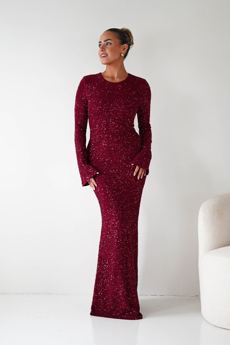 Bertina Long Sleeve Sequin Maxi Gown | Burgundy