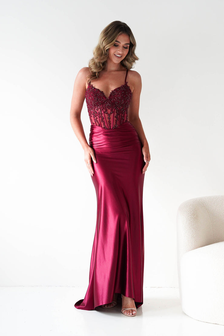 Raya Embellished Corset Gown | Dark Red