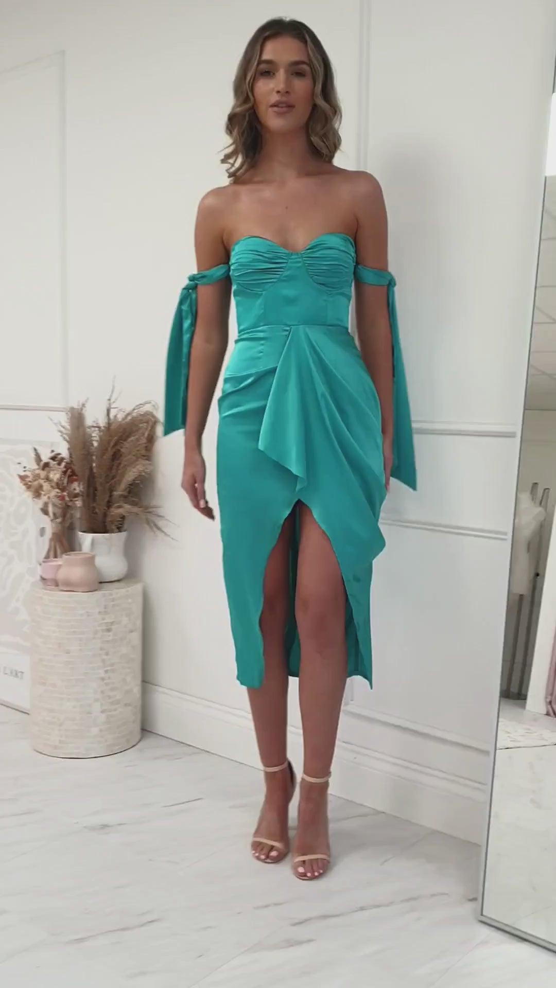 This stunning satin midi dress can be worn in numerous ways and has a flattering gathered waistline, you will be the best-dressed guest.