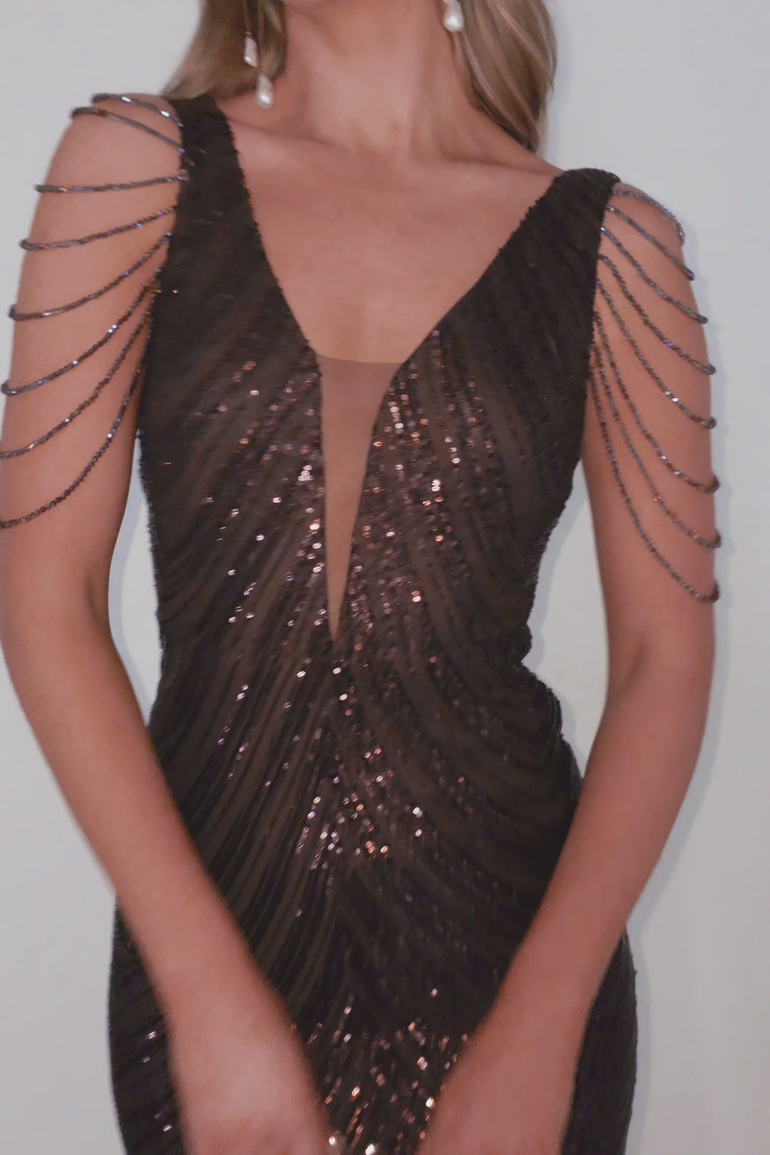 - All-over sequin beading in wave pattern for a sculpted, glamorous effect