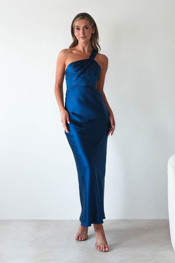 Ashlee Soft Satin One Shoulder Maxi Dress | Navy