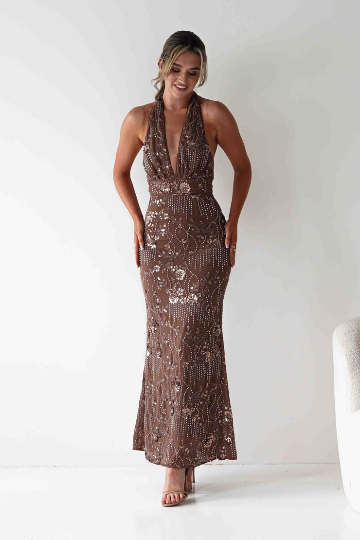 Sabrina Beaded Halterneck Maxi Dress | Brown